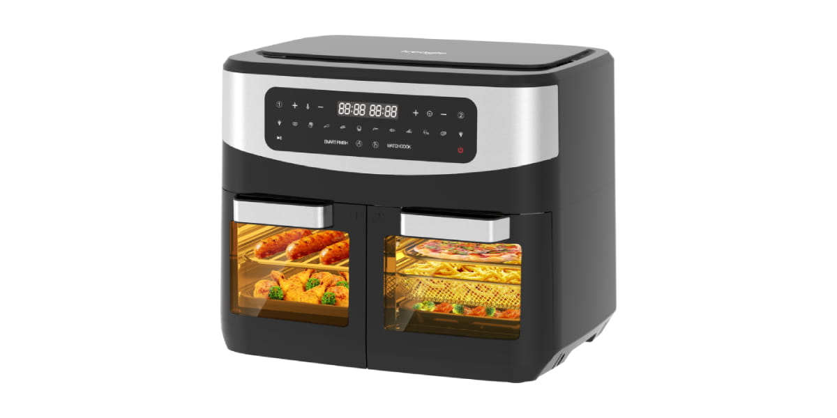 КТ-2247 выделяется конструкцией схожей с Tefal Dual Easy Fry Flex: он оснащен одной вместительной чашей на 8 литров и съемным разделителем, который позволяет превратить единое пространство в две независимые зоны. Благодаря наличию двух ТЭНов и двух вентиляторов, для каждой половины можно установить свои настройки температуры и времени. Общая мощность составляет 2400 Вт, что обеспечивает эффективную работу даже при полной загрузке. Температурный диапазон варьируется от 80 до 200°C, а программное меню включает 10 режимов. Особенностью модели является функция синхронизации конца приготовления, чтобы блюда в разных частях чаши были готовы одновременно.